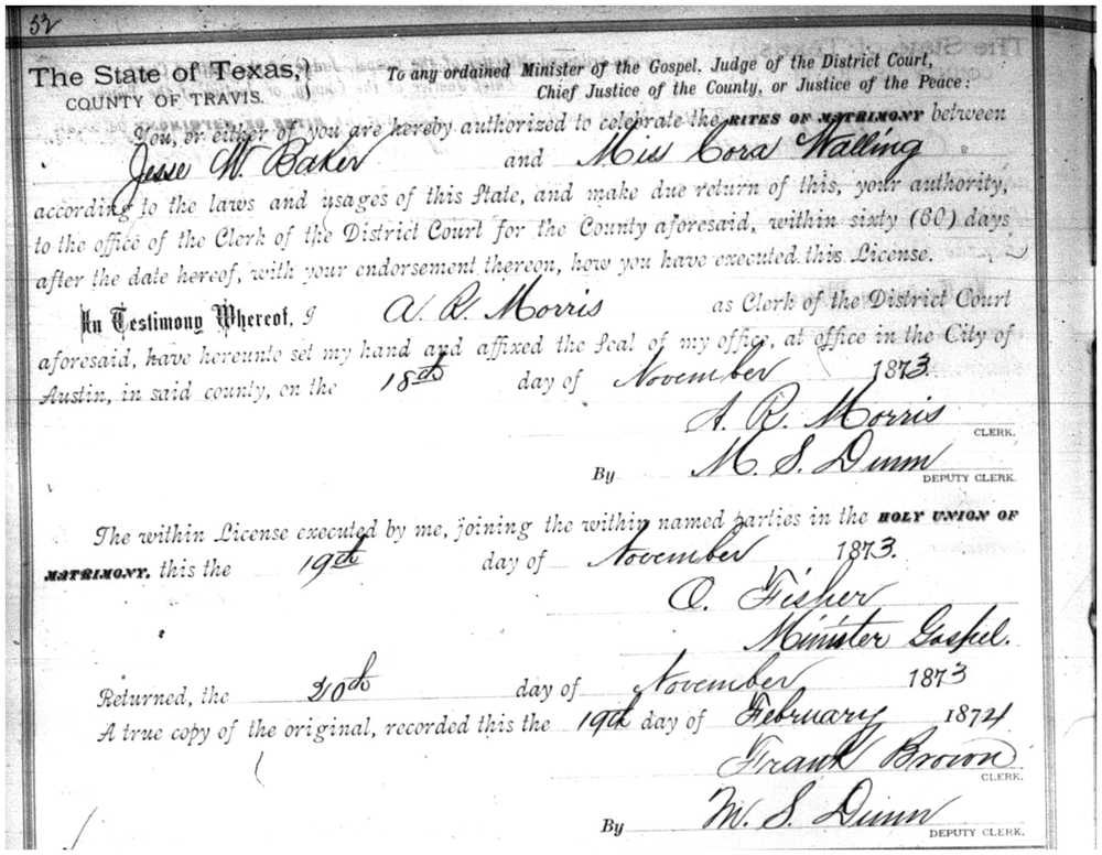 The first research stop was the census. In 1860, Cora, age 3, was living in her parents’ home, the oldest of two children. (2) So far, the family has not been located in the 1870 census. By 1880, she was back in her parents’ home as a 23 year old widow, Cora Baker. (3) But without her husband’s first name, searching on Bakers in the 1870 census to identify a future husband was challenging to say the least. A search of Travis County (TX) Marriage Records on microfilm in Salt Lake City turned up the marriage license (see below) and now we know that her husband was Jesse W. Baker – and that the date of the marriage was 18 November 1873. She was 17 years old.