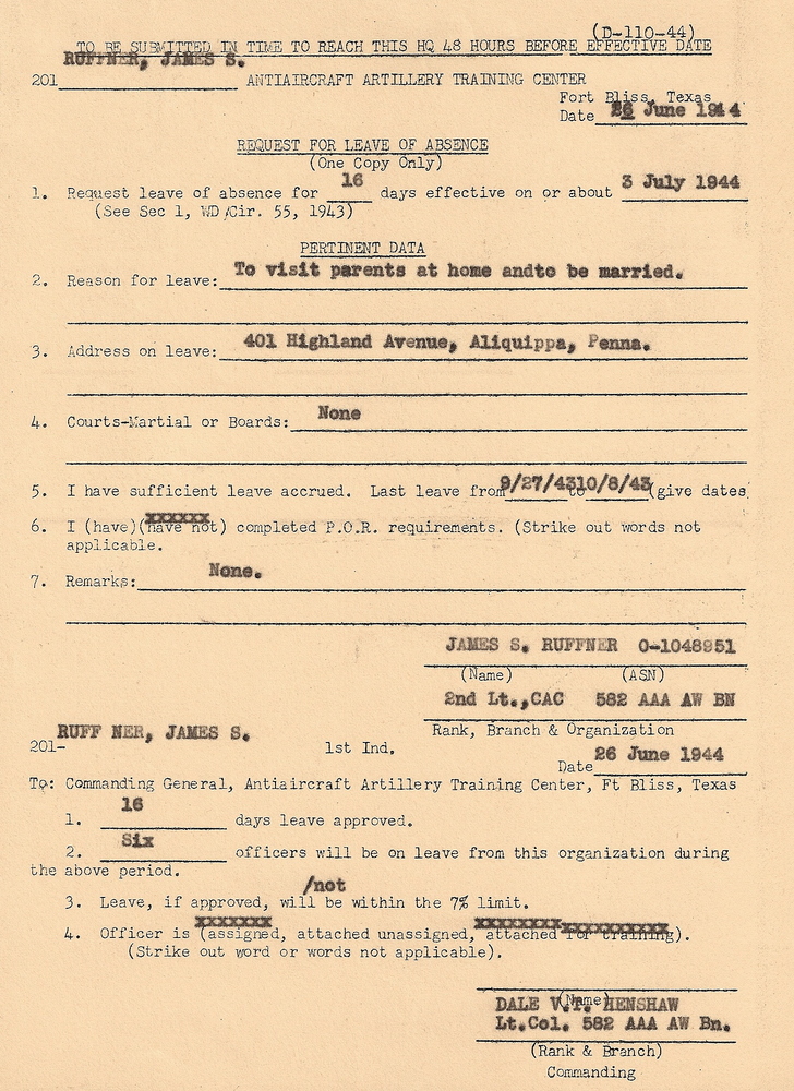 James S. Ruffner (1916-2008) served for 37 months during World War II in a wide variety of posts, the last as Court Provost overseeing trials of civilians in occupied Korea. (13) My siblings won’t be surprised to learn that, among his papers, I discovered a thick file documenting his service – including his draft card, orders, policies, equipment checklists and more. I’ve included just one item below of family interest. Plenty of material for a dedicated post! Thanks, Dad!