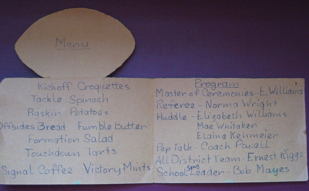 Mom was Master of Ceremonies at the Football Banquet her senior year and, I’ll bet you my last dollar, also designed the program/menu. Who else could come up with “Kickoff Croquettes” and “Touchdown Tarts”?
