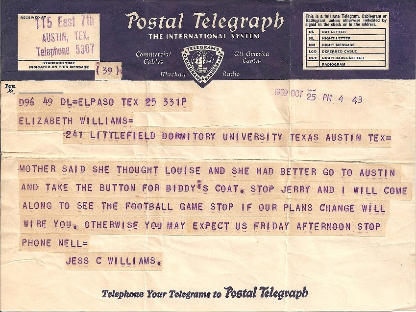 ….she was far away from home and missed them all — younger siblings Louise and Jerry, her mother and father.  She labelled this freshman year telegram “the best news I ever got” and a football game (probably not a missing button) was at the center of it: