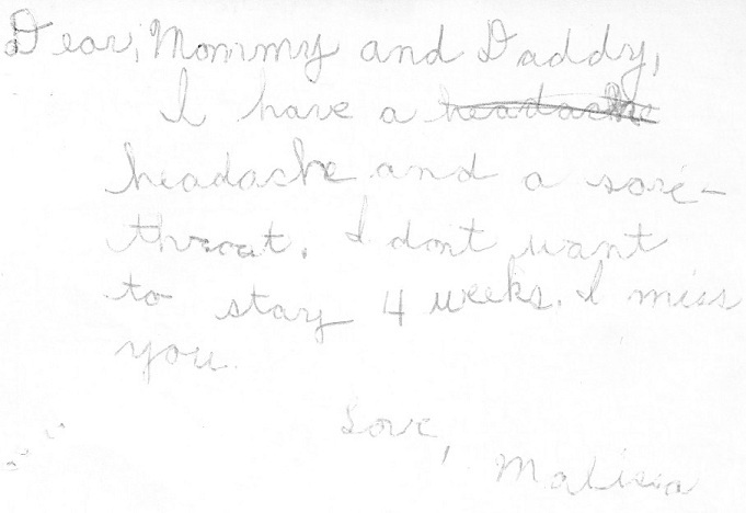 “Dear Mommy and Daddy, I think I need more money in my trading post account. I want three pictures…I like it very much here. Love, Malissa”