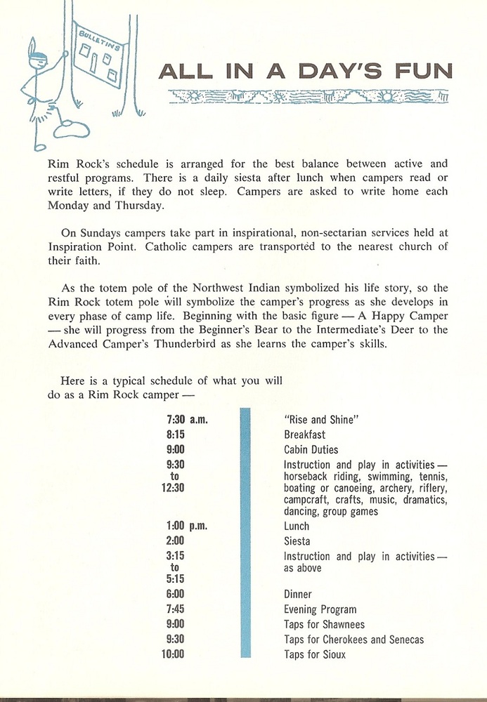 I went to Camp Rim  Rock for four summers in the mid 1960s.  Campers were divided into four “tribes”, of which the Shawnees were the youngest.   Here’s  the daily schedule (1):