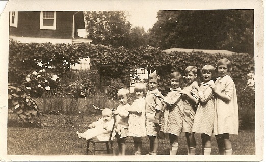 Alice is not in this next picture but two more children are, including John’s father, the youngest child standing. This shot reminds me of the movie, Cheaper by the Dozen (the Clifton Webb-Myrna Loy version, not the Steve Martin version), especially since the family was living in New Jersey by then. Now that they are nicely arranged in age order, I can state emphatically that Yvonne is fourth from the right.