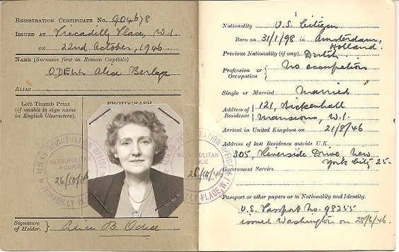 And here is Alice in 1946, pictured in her Certificate of Registration, issued in London under Aliens Order, 1920 — still remarkably beautiful…not to mention all the great genealogical information!