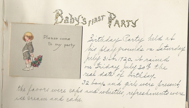 His mother started it.  He was an only child, born twelve years into the marriage of his parents – enough said.   Here’s an invitation to the first “formal” party held to honor the occasion – his 4th birthday in 1920.  32 invited friends – and he wasn’t even in school yet!