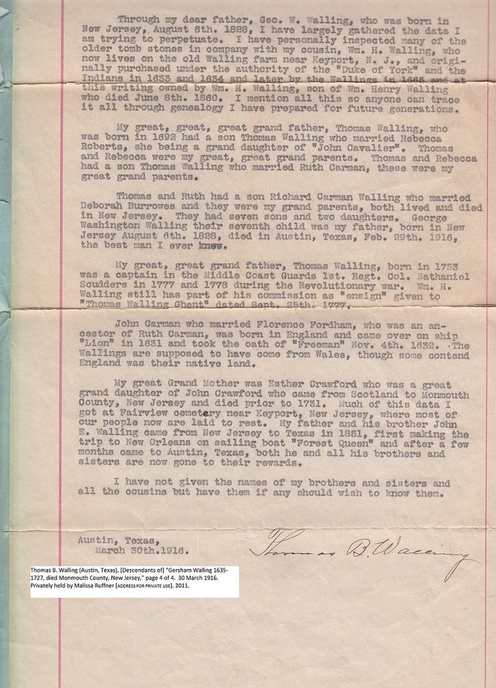 I showed Mary a Walling genealogy report — one of my dearest possessions and a very early genealogy acquisition.  It was written by Thomas B. Walling (her great uncle and our 2nd great uncle) in 1916, typed on onion skin paper with the traditional blue law office cover.  In it, he described his trip to New Jersey to read Walling family headstones with a cousin and referred to other materials consulted, concluding the paragraph with “I mention all this so anyone can trace it all through genealogy I have prepared for future generations.”