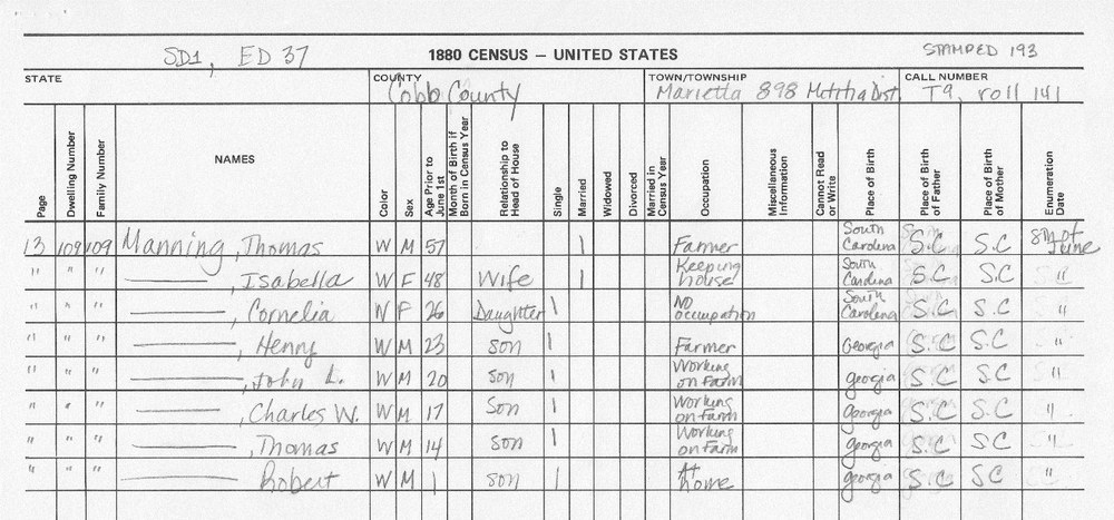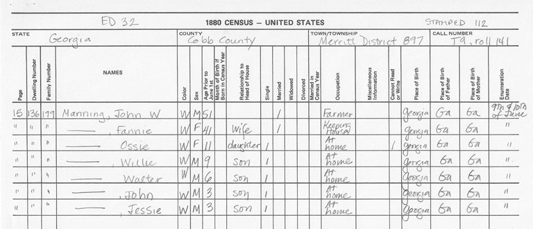 Last year, I located the 7-member family of Ocie Ola [Ossie in the census] Manning (my great grandmother in my mother’s paternal line) in the 1880 census in Cobb County, Georgia,  downloaded the image, and created a citation. It is on hand.